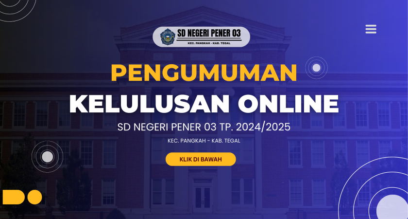 Pengumuman Kelulusan Online SDN Pener 03 kec. Pangkah Kab. Tegal kali ini pada tahun 2025 menggunakan sistem online guna mengembangkan pengetahuan dan mengenalkan sistem digital terhadap para siswa siswi kelas 6 pada era perkembangan digital saat ini.